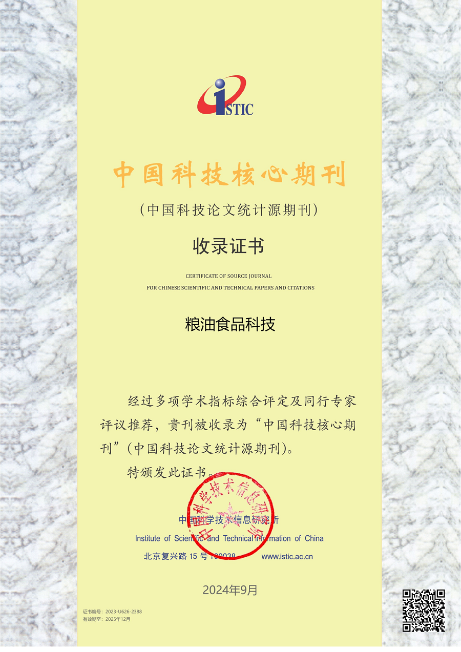 近日,我院收到中国科学技术信息研究所发来的2024年中国科技核心期刊入选证书。院刊《粮油食品科技》继续入选中国科技核心期刊,这是自2017年起,连续8年被其收录。中国科技核心期刊是国内公认权威的科技论文统计源期刊,是各学科领域中重要的、能反映本学科发展水平的科技期刊。