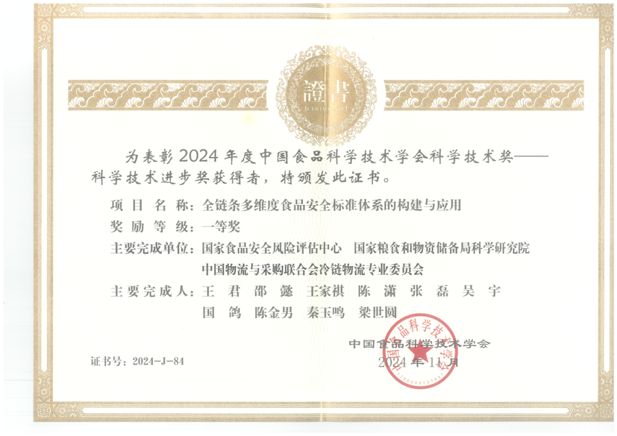 近日,我院作为主要完成单位参与的“全链条多维度食品安全标准体系的构建与应用”项目荣获2024年中国食品科学技术学会科学技术进步奖一等奖。
