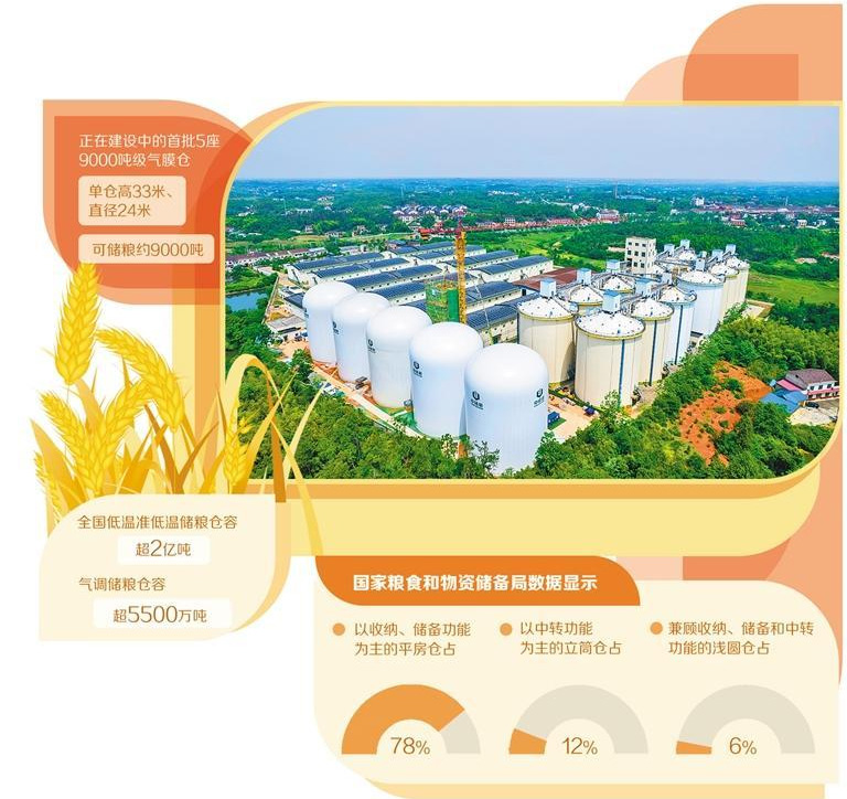 科技在进步,新型粮仓也在不断涌现。中储粮集团公司建设的气膜钢筋混凝土圆顶仓,气密性与保温性优越,兼具经济、社会及生态效益,助力节能减排。河南工业大学开发的地下浅圆仓,创新利用浅层地能,实现天然准低温储粮。湖南粮食科技创新有限公司自主研发的智能化氮气储粮集装箱,集成智能控温、氮气气调、区块链溯源等关键技术,具备气密性、承压性、防水性、隔热性良好以及精准溯源能力。“这些新型粮仓与传统粮仓形成优势互补、协同发展的新格局,有力推进绿色储粮、品质保粮、数字管粮,进一步增强国家粮食安全和应急保障能力。”国家粮食和物资储备局有关负责人说。