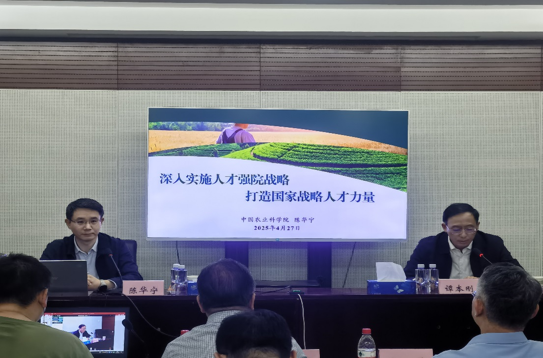 为学习贯彻党的二十大和二十届三中全会精神,深入实施人才强国战略,认真落实国家局领导到我院调研时的指示要求,深入推进重大成果培育、领军人才和科研团队建设,4月27日下午,我院举办第50期“粮科大讲堂”,邀请中国农业科学院党组成员、人事局局长陈华宁作题为“深入实施人才强院战略 打造国家战略人才力量” 专题讲座。讲座由院党委副书记、院长谭本刚主持。