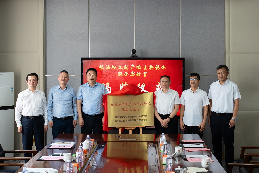 8月26日,国家粮食和物资储备局科学研究院与山东泰山生力源集团股份有限公司签署粮油加工副产物生物转化联合实验室共建合作协议。国家局总工程师、院党委书记滕增泰,泰安高新区党工委书记、管委会主任宋鸿鹏,生力源公司总裁徐启民出席签约仪式,并共同为联合实验室揭牌。科学研究院副院长邱平,生力源公司副总裁李军训分别代表双方单位签约。院首席科学家李爱科参加签约仪式。