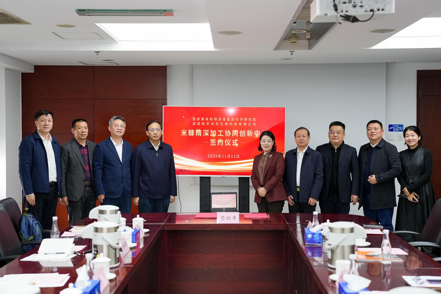 11月12日,国家粮食和物资储备局科学研究院与湖南助农米珍生物科技有限公司签署《米糠精深加工协同创新中心共建协议》。科学研究院党委副书记、院长谭本刚,科学研究院副院长邱平,湖南省南县县委书记钟剑波,湖南助农米珍生物科技有限公司董事长黄庆明出席签约仪式。